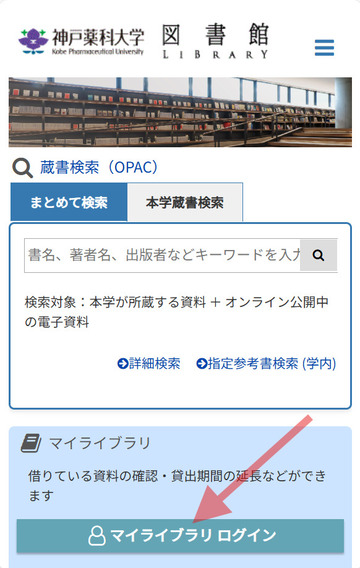 ①図書館のトップページ「マイライブラリ ログイン」をクリック