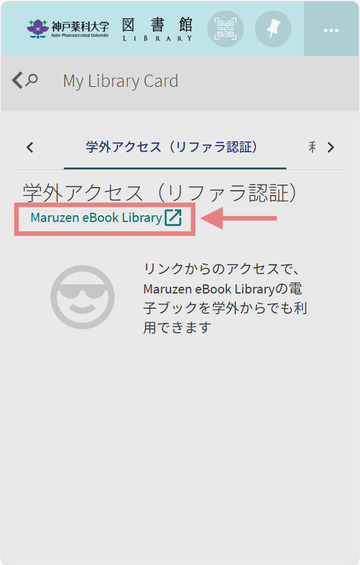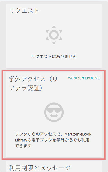 ③マイライブラリメニューの下のほうにある★学外アクセス(リファラ認証)を選択し、「Maruzen eBook Library」のリンクをクリック