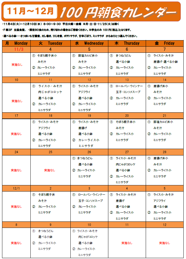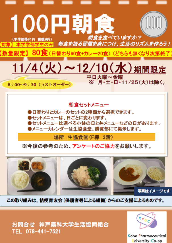 2025年度後期も、栄養に配慮した朝食を100円で提供いたします。