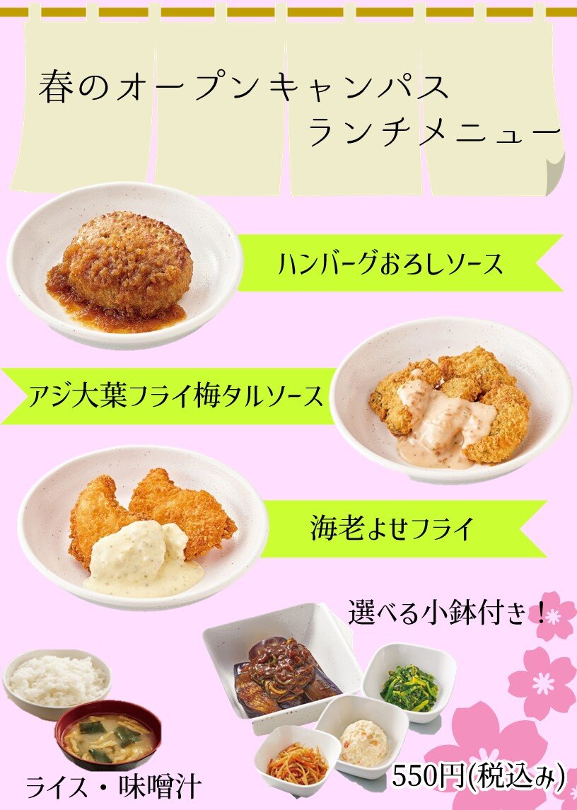2026/02/27 イベント 春のオープンキャンパス(4/19)開催のお知らせ(第2弾) オープンキャンパスの楽しみと言えば、食堂でのランチ体験もその一つかと思います!当日は3つのメニューをご用意。選べる小鉢が付いてます。ぜひ絶景の食堂でランチ体験をお楽しみください。 関連ニュース 2026/02/26 春のオープンキャンパス(4/19)予約受付開始しました! イベント 入試 2026/02/20 春のオープンキャンパス(4/19)開催のお知らせ(第1弾) イベント 入試 2026/02/17 全学年対象キャリアイベント「シゴトの魅力発見セミナー」を開催しま した。(2/6) イベント