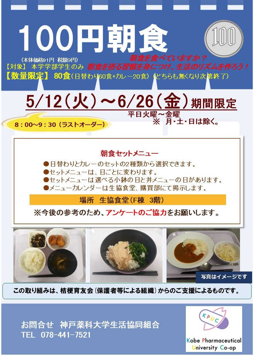 2026年度前期も、栄養に配慮した朝食を100円で提供いたします。